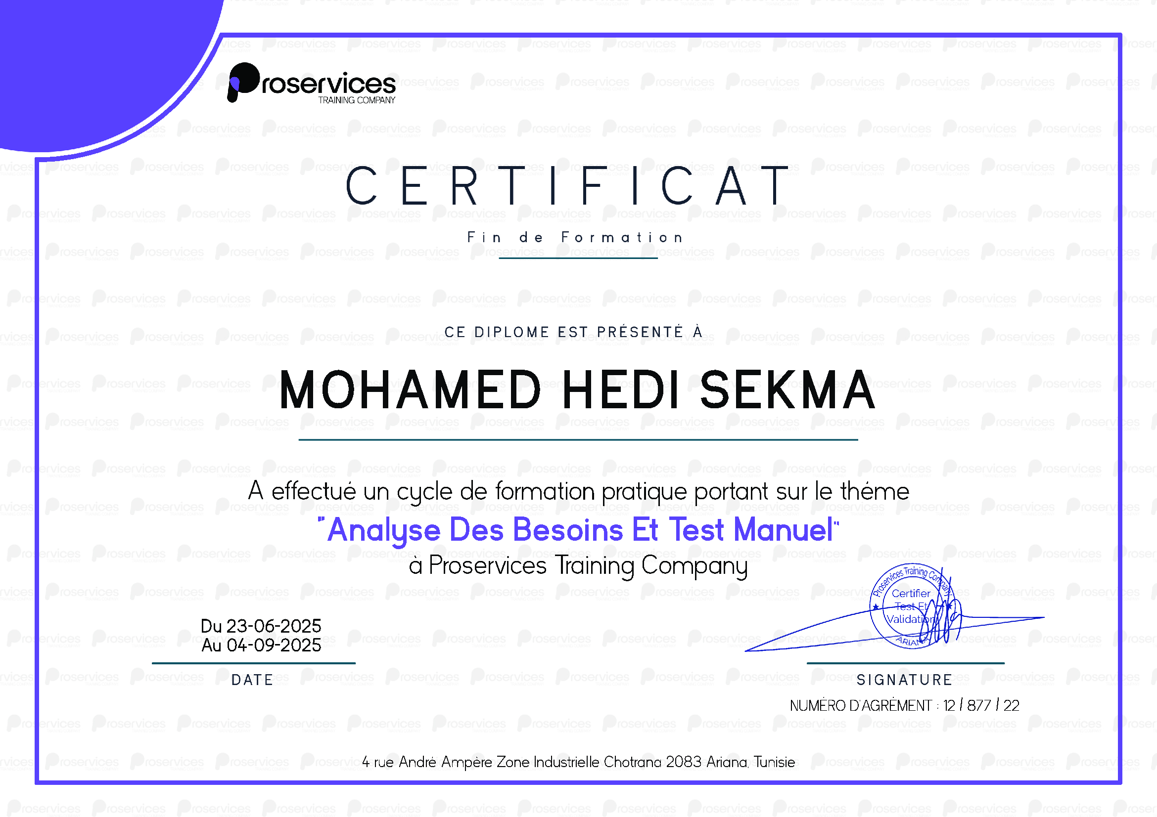Souhaitant compléter mon profil technique, j’ai ensuite choisi de me spécialiser dans le domaine des Tests Logiciels. J’ai suivi une formation approfondie chez Proservices Training Company, couvrant les tests manuels, les tests automatisés avec Selenium, les tests API, les tests SQL, ainsi que la méthodologie Agile Scrum. Ce parcours m’a permis d’obtenir plusieurs certifications renforçant ainsi ma capacité à contribuer activement à l’assurance qualité des projets numériques.